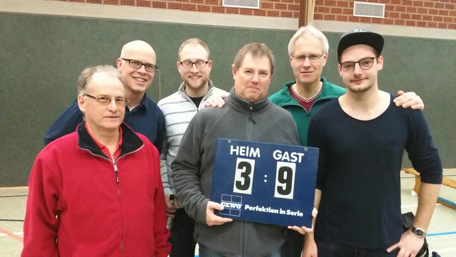 Drei Spiele in vier Tagen lautete das Marathonprogramm der Ersten. Zunächst gab es gegen eine vermeintlich schwächere Truppe aus Meppen, die mit vielen Verletzungssorgen angereist war, nur ein 8:8-Unentschieden. Eine riesige Enttäuschung und ein kleiner Rückschlag im Titelkampf. Tags darauf wurden dann die Jungs aus Bentheim mit 9:2 geschlagen. Diesen Schwung wollte das Team dann auch mit zum Meistergipfel gegen den Tabellenzweiten aus Riemsloh mitnehmen, um dort einen Sieg einzufahren und die Führung auszubauen. In einer sehr abwechslungsreichen und spannenden Partie mit häufig wechselnden Führungen gab es schlussendlich wieder eine Punktteilung. Trotz einer verspielten 8:6-Führung war die Mannschaft insgesamt zufrieden, da die Führung behauptet werden konnte. Garanten der zurückliegenden Erfolge sind Sebastian Memering (12:0) und Thomas Winsenborg (8:1), die mit ihren starken Leistungen im Einzel und Doppel ein großer Rückhalt des Teams sind.